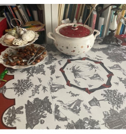 Les nappes à motifs Toile de Jouy sont des nappes qui sont ornées d'un motif classique qui représente des scènes ou des paysages de style français du XVIIIe siècle. Les motifs Toile de Jouy sont souvent imprimés en une seule couleur, généralement le noir, le rouge, le bleu ou le vert, sur un fond blanc ou crème. La Toile de Jouy est un choix parfait pour ceux qui apprécient l’esthétique française traditionnelle et souhaitent l’incorporer dans leur décoration intérieure ou extérieure.